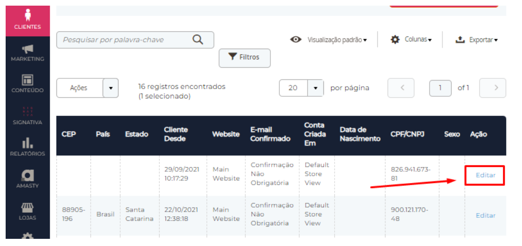 Localize o cliente desejado e clique em “Editar” para acessar o cadastro