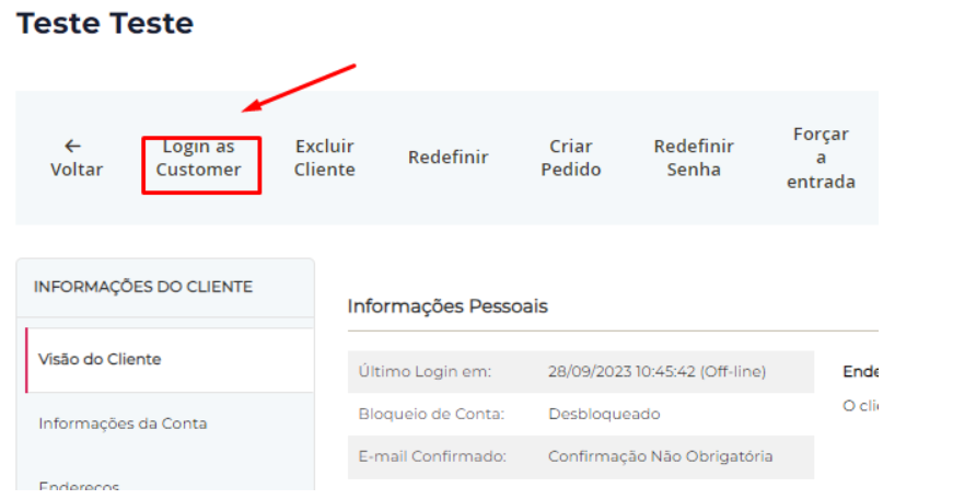 Um recurso do Signa Commerce permite que o administrador da loja faça login como cliente. Esse diferencial pode ser utilizado por lojistas que desejam alterar dados de clientes, verificar os pedidos recentes, os últimos produtos comprados, entre outras coisas.