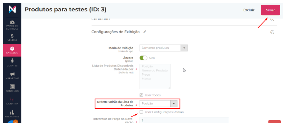 Para que as configurações de ordenação funcionem corretamente, é necessário que seus produtos estejam listados pela ordem Posição.