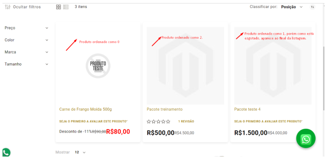 OBS: Caso o produto esteja esgotado e tenha sido habilitado na loja para que os produtos esgotados reflitam, eles irão para o final da listagem, nesse caso não aparecem na ordem estabelecida na posição. E caso tenha sido selecionado para não refletirem na loja, não irão aparecer na categoria.