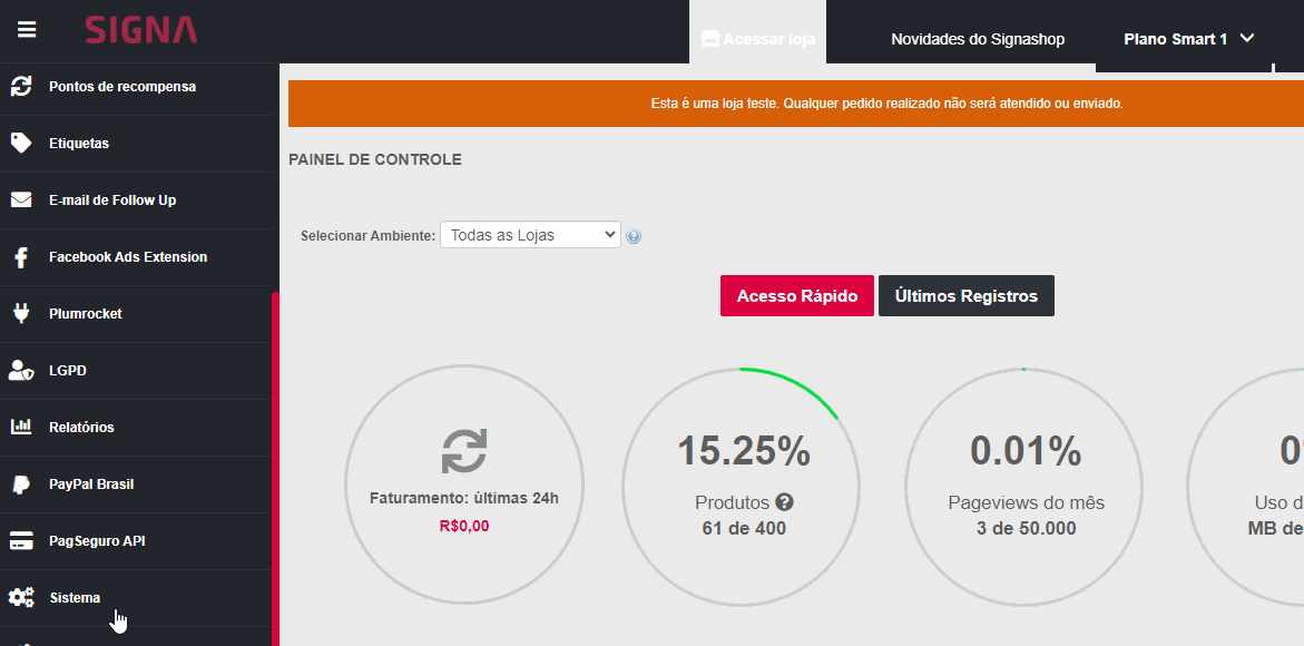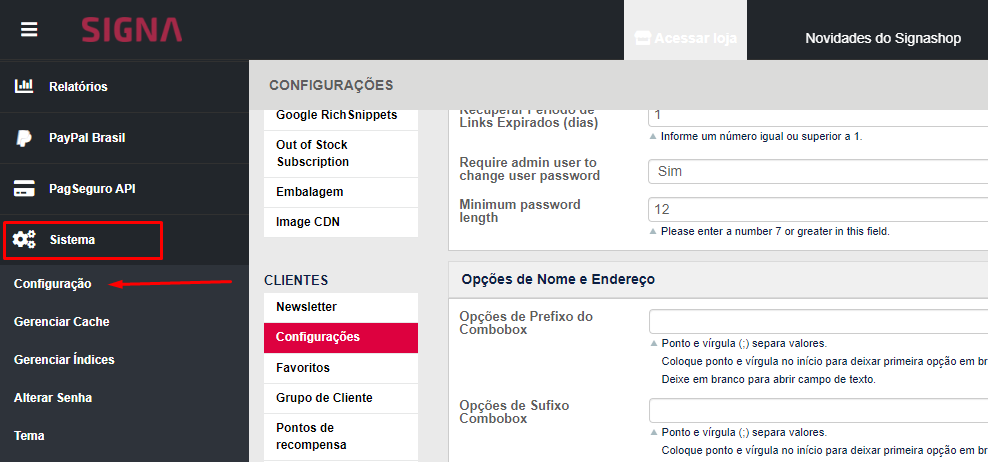 2.1 – No seu painel administrativo do Signashop, acesse Sistema > Configuração > Vendas > Formas de Pagamento.