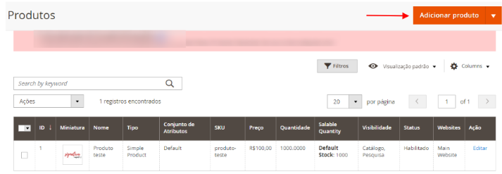 No seu painel administrativo, clique em Catálogo e na opção Produtos. Toda vez que você quiser inserir novos produtos, basta clicar no botão Adicionar produto, que encontra-se no lado direito do painel.