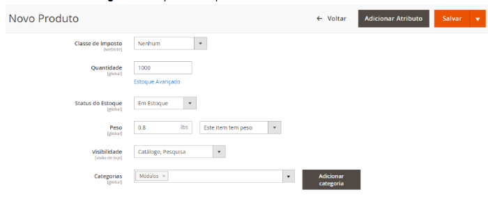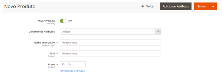 - O sku será preenchido automaticamente com o nome do produto, caso deseje outro nome ou associar com o código do produto que possui em sua loja, basta editar o campo.