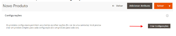 Você consegue definir o tipo de produto que deseja criar, basta clicar em cima da seta e selecionar o tipo de cadastro desejado. Neste passo a passo, iremos mostrar como cadastrar um produto configurável, por isso selecionamos a opção Configurable Product.