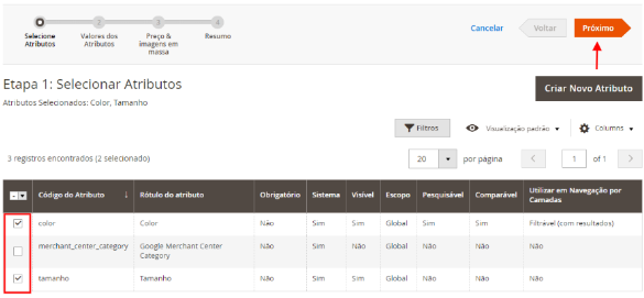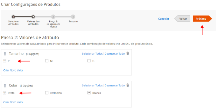 - Selecione as variações dos atributos. Cada variação irá criar um produto único, específico para cada variação. Após selecionar, clique em Continuar