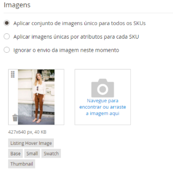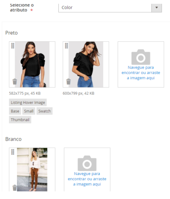 - Opção “Aplicar imagens únicas por atributos para cada SKU”: permite o envio de imagens conforme o atributo. Útil para produtos com variações. Exemplo: Vendemos em nossa loja camisetas nas cores: Preto e Branco. Desta forma, quando o meu cliente escolher a cor do produto em minha loja, quero que para cada cor apareça o produto correspondente. Logo, devo cadastrar nesta opção as imagens correspondentes para cada cor.