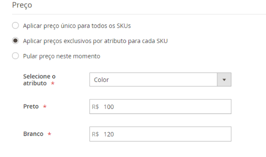 - Opção “Aplicar preços exclusivos por atributo para cada SKU”: define o valor do produto com diferenciações. Ou seja, produtos diferentes, valor diferentes.