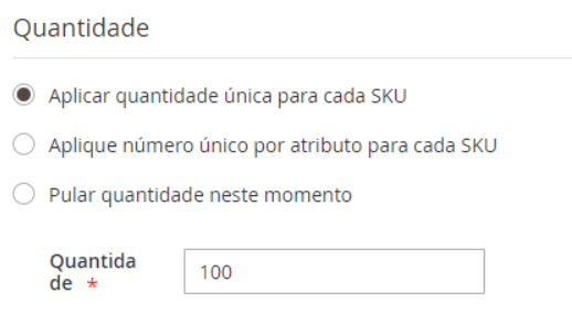 - Opção “Quantidade única para cada SKU”: todos os produtos que serão criados assumiram a mesma quantidade de estoque.