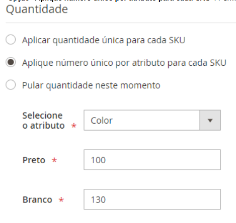 - Opção “Aplique número único por atributo para cada SKU”: Permite definir quantidades de produtos em estoque conforme suas variações.