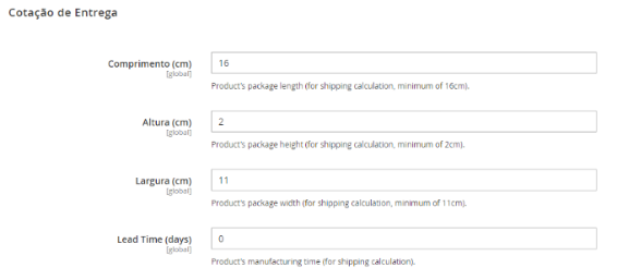 Nesta aba defina as dimensões do seu produto, tais dimensões serão utilizadas para o cálculo do frete pelo seu meio de entrega.