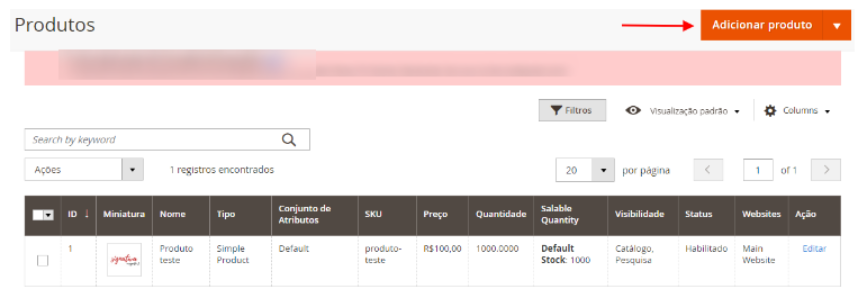 No seu painel administrativo, clique em Catálogo e na opção Produtos. Toda vez que você quiser inserir novos produtos, basta clicar no botão Adicionar produto, que encontra-se no lado direito do painel.
