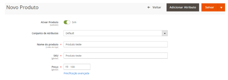 - O sku será preenchido automaticamente com o nome do produto, caso deseje outro nome ou associar com o código do produto que possui em sua loja, basta editar o campo.