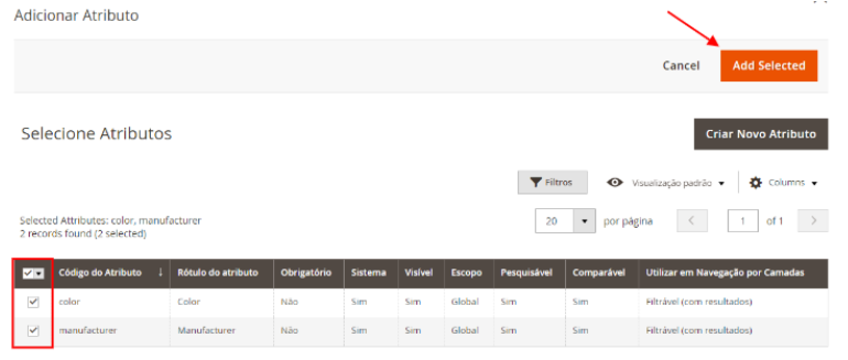 - Para utilização de atributos já existentes na loja, selecione os que deseja e clique em Add Selected para que sejam adicionados no cadastro deste produto