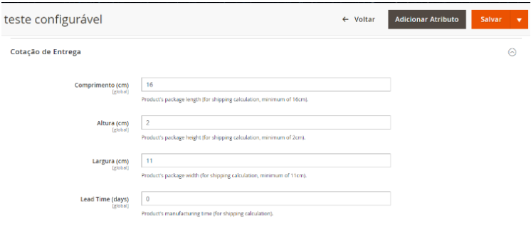 - Em Cotação de Entrega defina as dimensões do seu produto, tais dimensões serão utilizadas para o cálculo do frete pelo seu meio de entrega.