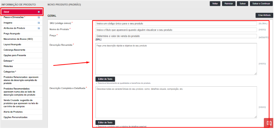 1.3 – Na aba "Geral", você irá inserir todas as características de seu produto, como: código, nome, preço e descrição. Observe o exemplo: