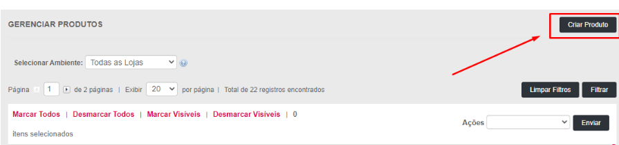 1.1 – No painel do administrador, clique em Catálogo > Gerenciar Produtos. Toda vez que você quiser inserir novos produtos, basta clicar no botão Criar Produto, que encontra-se no lado direito do painel.