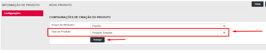 1.2 – Selecione o tipo de produto com que você quer trabalhar, neste caso, trabalharemos com o Produto Simples.