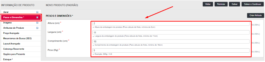1.4 – Vá até a segunda aba, denominada "Pesos e Dimensões". É importante ressaltar que o peso, largura, altura e comprimento a que o sistema se refere, diz respeito ao pacote que o produto será enviado, e não ao produto em si.