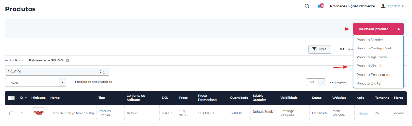 1.2 - Com a página de produtos aberta clique sobre seta no botão “Adicionar produto” para escolher o tipo de produto que deseja criar, neste caso selecionaremos o produto do tipo “Virtual”.