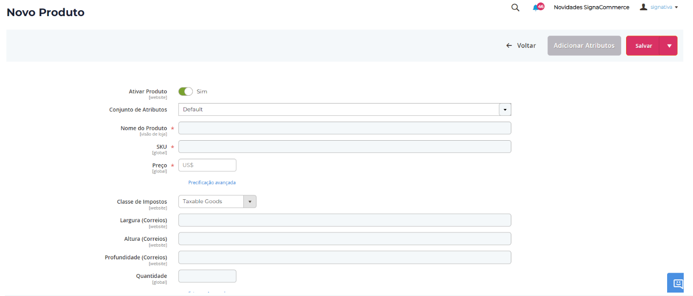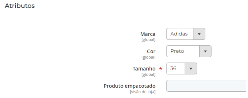 Conjunto de Atributos: Clique no campo “Conjunto de atributos” e selecione o grupo de atributos a ser utilizado no produto;