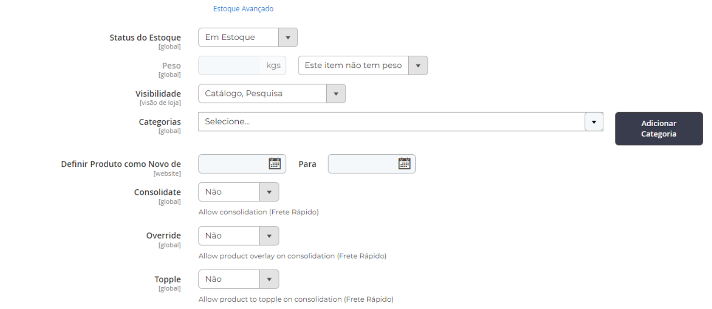 Categorias: Informar a categoria a qual o produto ficará vinculado para visualização no catálogo.