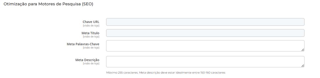 Meta Palavras-Chave: As palavras-chave meta são usadas por alguns mecanismos de pesquisa. É uma prática recomendada inserir algumas palavras-chave para ajudar o produto a ganhar mais visibilidade.