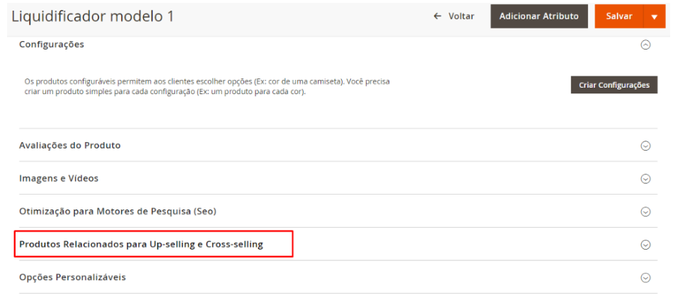 Rolar a página para baixo e selecionar o item: Produtos Relacionados para Up-selling e Cross-selling