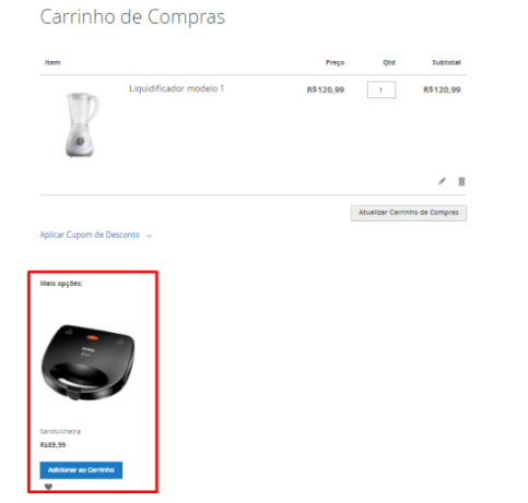 Utilizado para indução do cliente comprar mais”compra por impulso”. Essa opção irá aparecer no carrinho na parte inferior da tela com o título de: Mais opções: