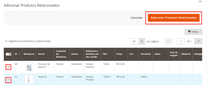 Selecione os produtos que deseja relacionar, essa ação pode ser feita quantas vezes quiser, e quantos produtos desejar.